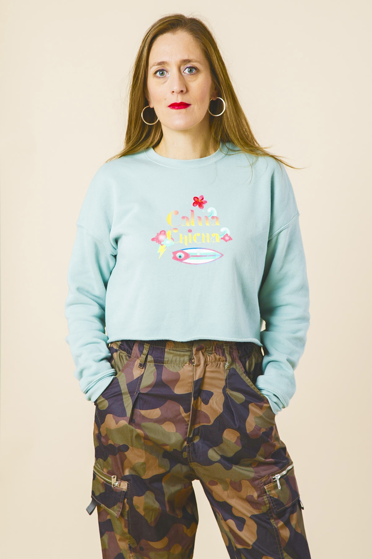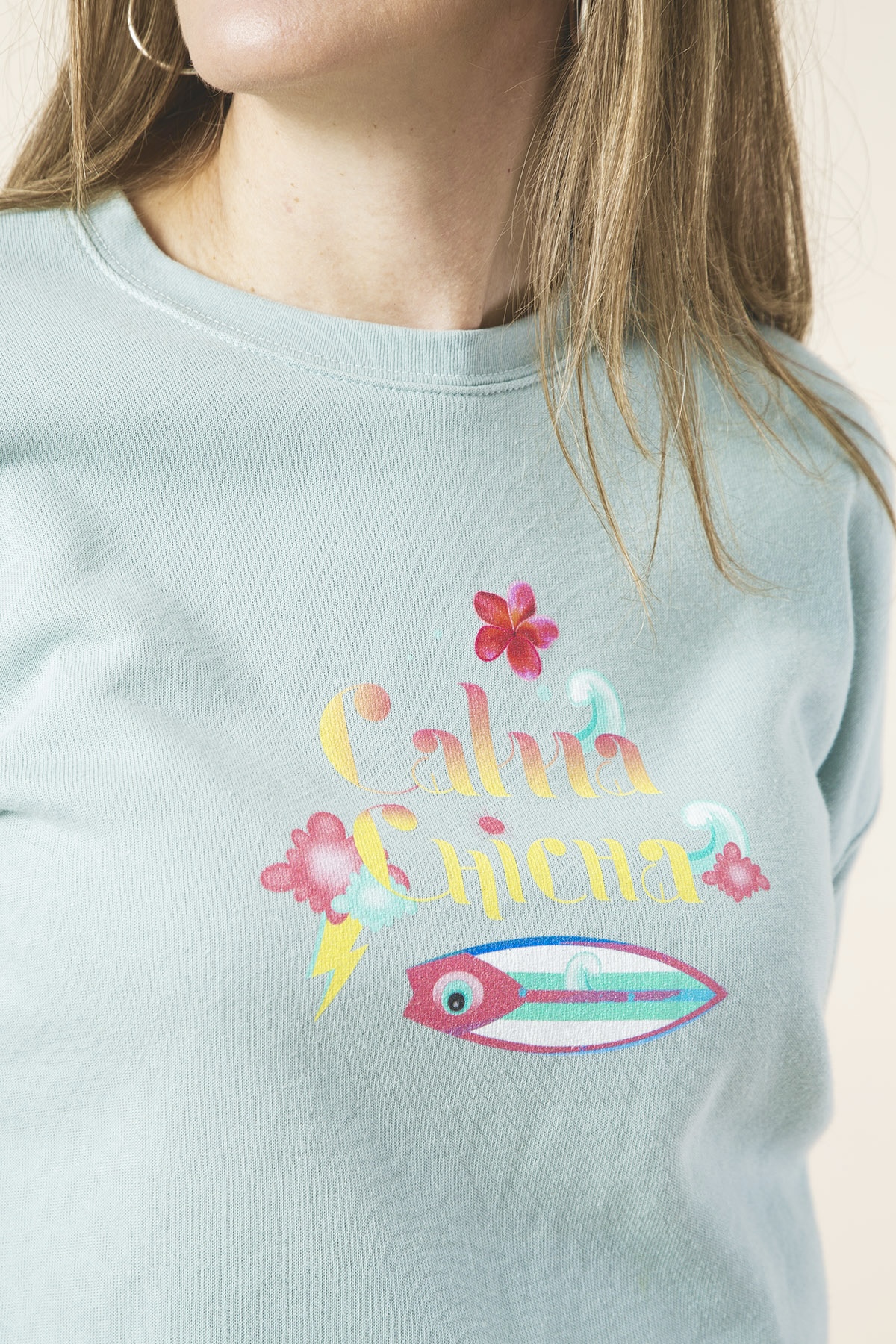 Sudadera cropped en color pastel verde agua marina logo surfero de Calma Chicha, súper gustosita.