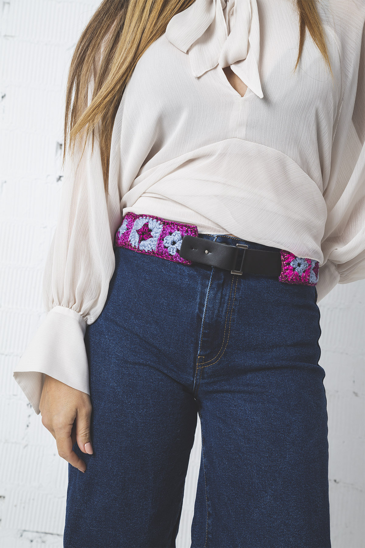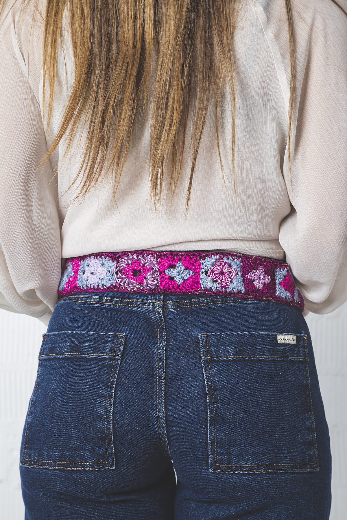 Cinturón de crochet hecho a mano en tonos malvas, azules y rosas.