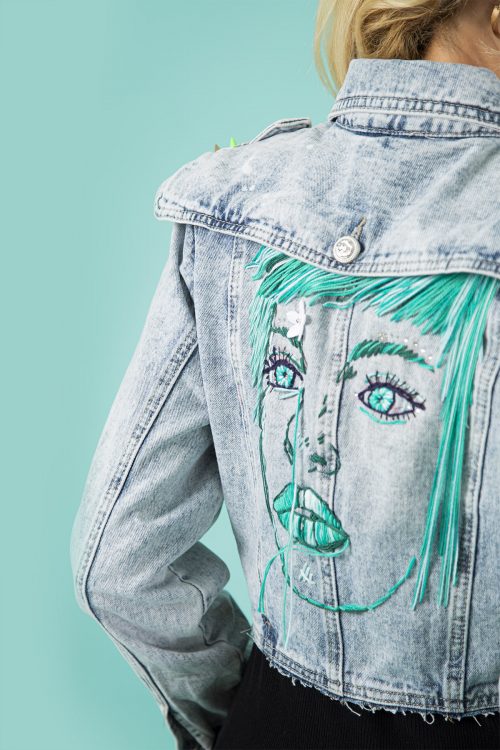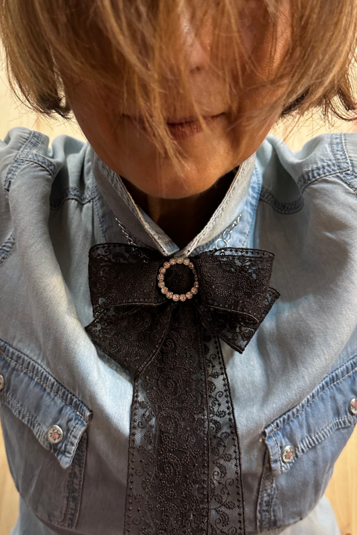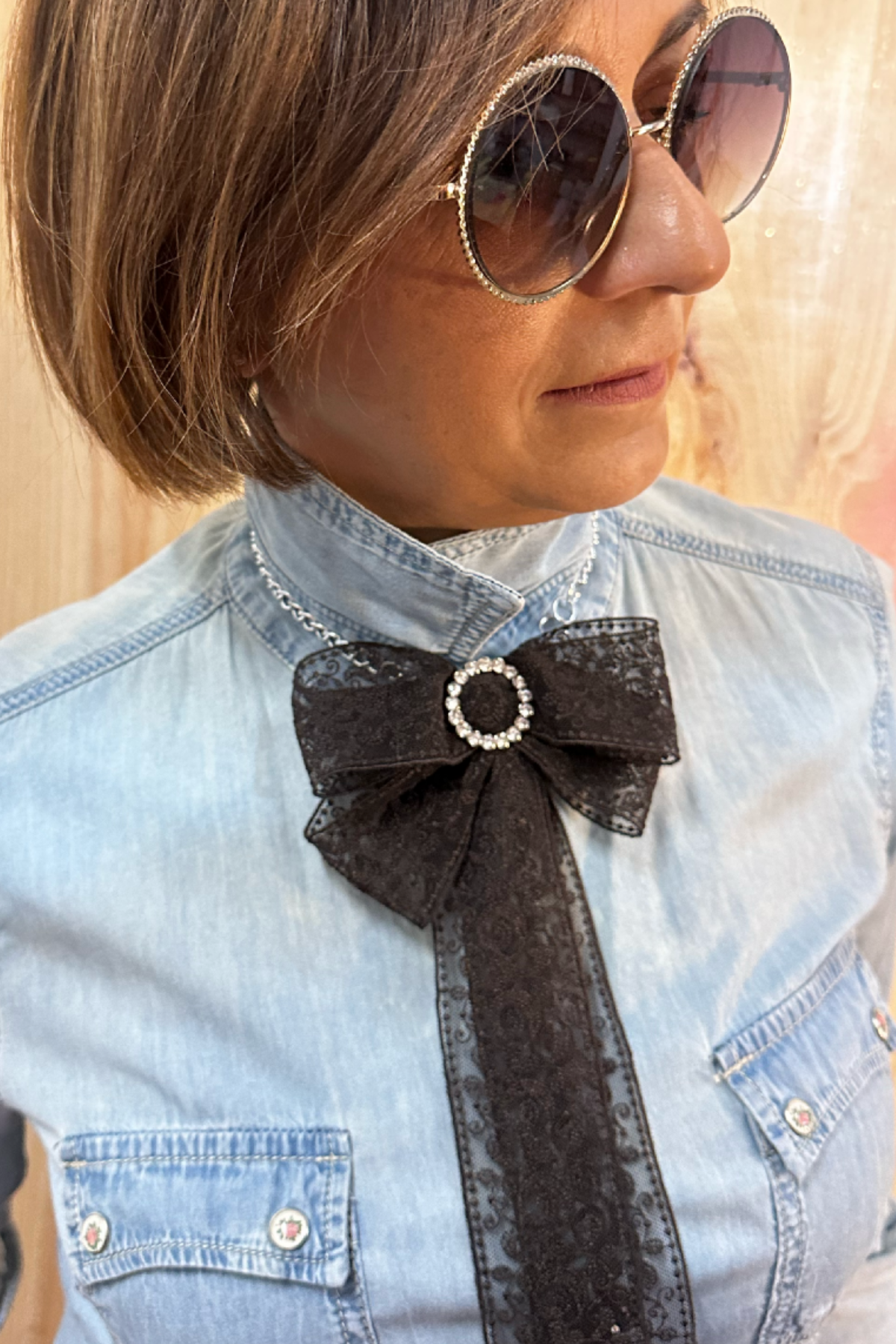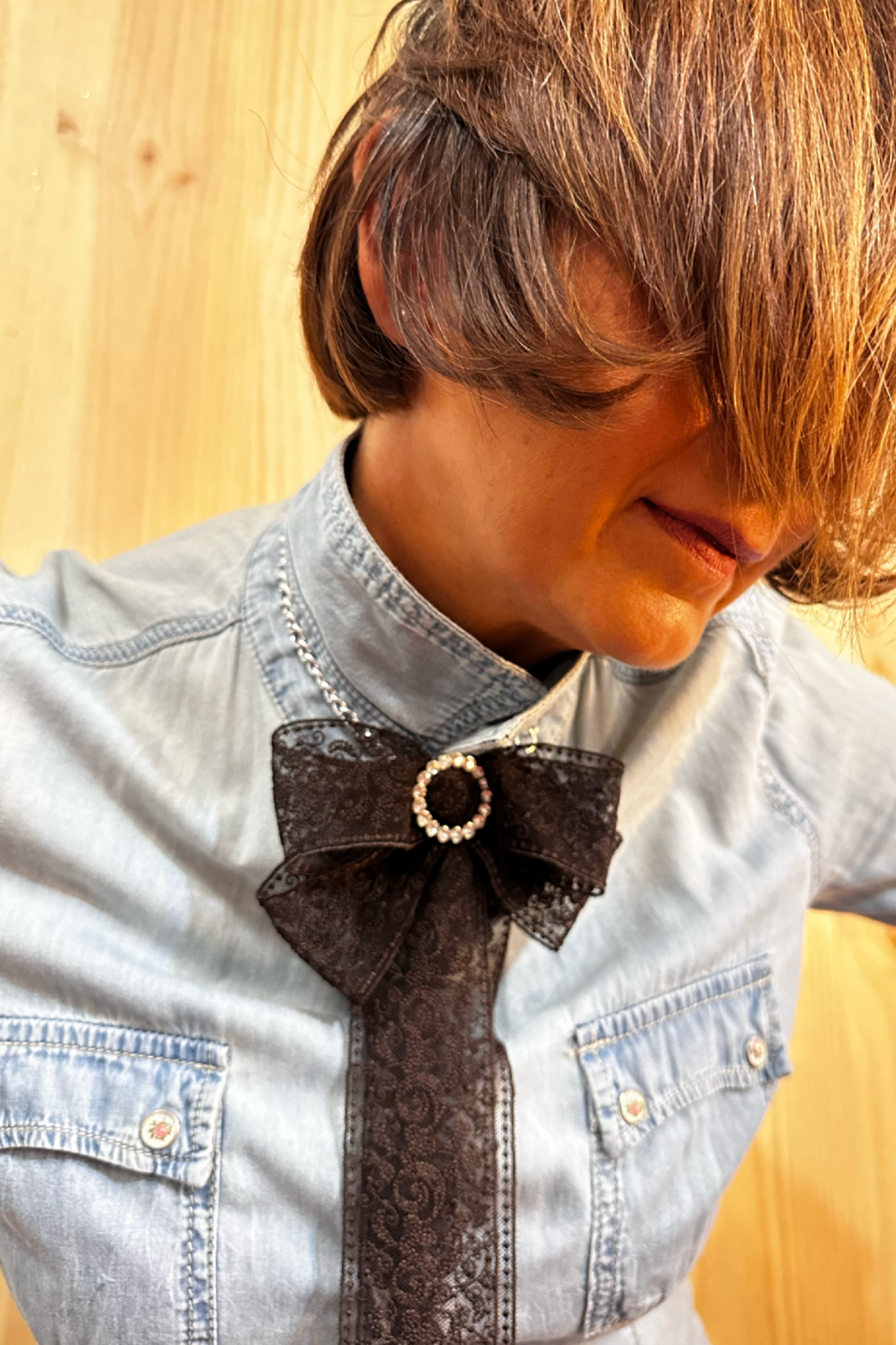Collar de lazo de encaje con lazada, aplique de cristales y cadena al cuello.